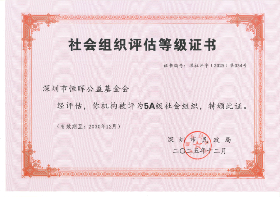 2020年12月恒晖获评为5A级公益基金会。